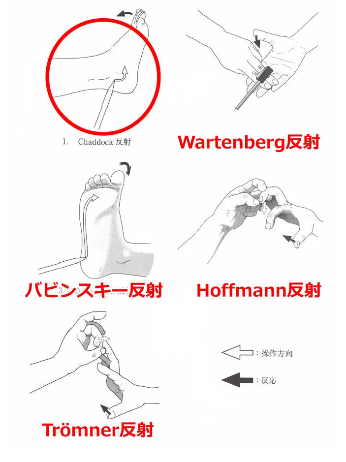 ・Chaddock反射(チャドック反射)は、足の外果の下方を後ろから前へこする。バビンスキー反射の変法である。