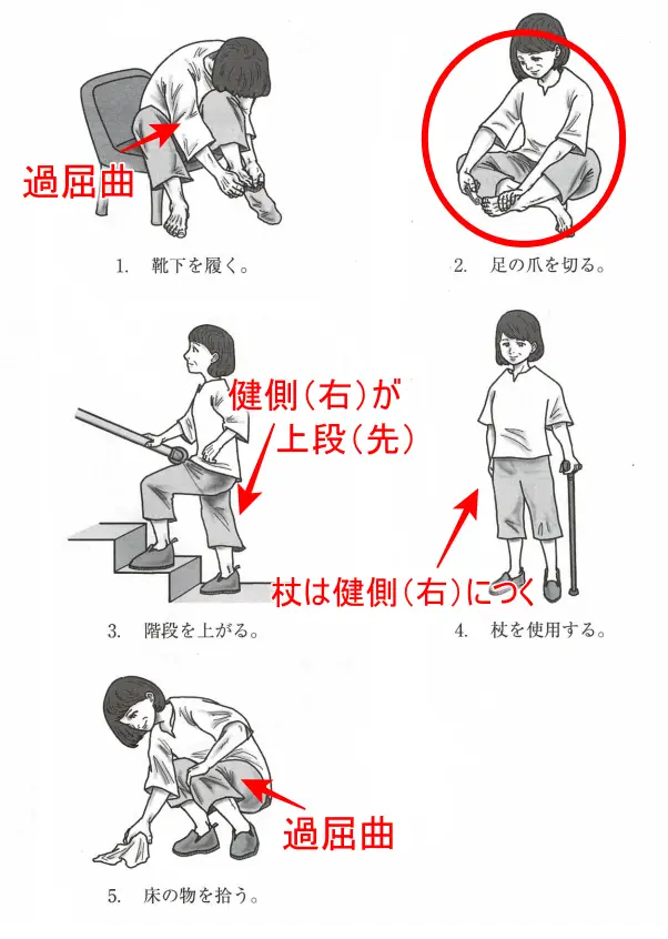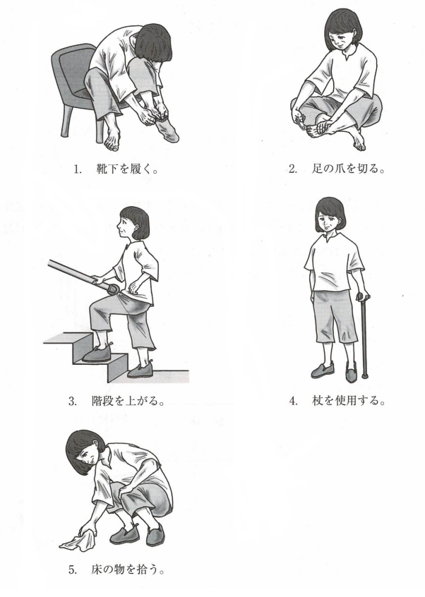 2.〇 正しい。足の爪を切る場合、図のように前屈姿勢にならない(股関節過屈曲)よう自動する。