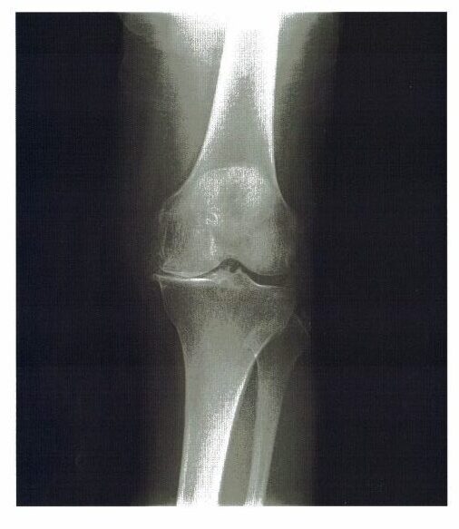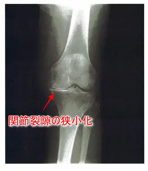 ・立位のX線写真:膝関節内側の関節裂隙の狭小化あり。